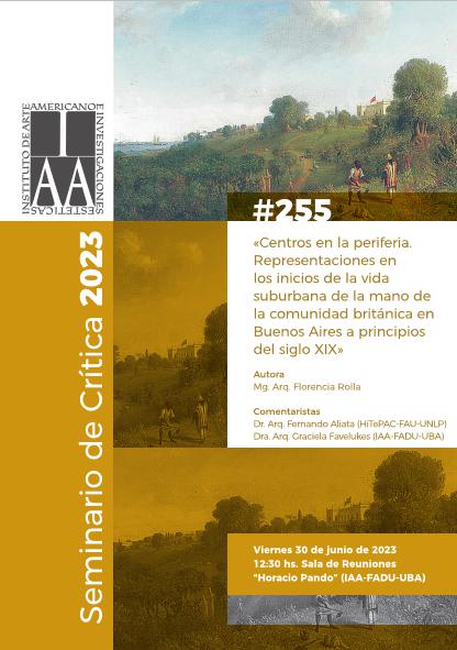 Rolla, F. (2023). “Centros a la periferia. Representaciones en los indicios de la vida suburbana de la mano de la comunidad británica en Buenos Aires a principios del siglo XIX”. En Seminario de Crítica Nº255. Buenos Aires, Instituto de Arte Americano e Investigaciones Estéticas “Mario J. Buschiazzo” (IAA). Facultad de Arquitectura, Diseño y Urbanismo (FADU). Universidad de Buenos Aires (UBA).